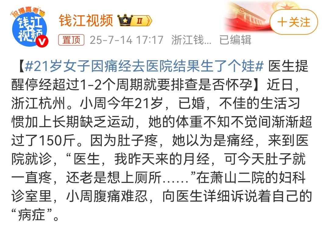 咋回事呢?小周平时不爱动,饮食习惯也不太好,体重早就超过 150 斤了。她跑到萧山二院的妇科诊室,捂着肚子跟医生说:“大夫,我昨天刚来的月经,今天肚子就疼得受不了,还老想上厕所。” 医生一检查可吓了一跳,这哪是痛经啊,宫口都开了,分明是要生了!