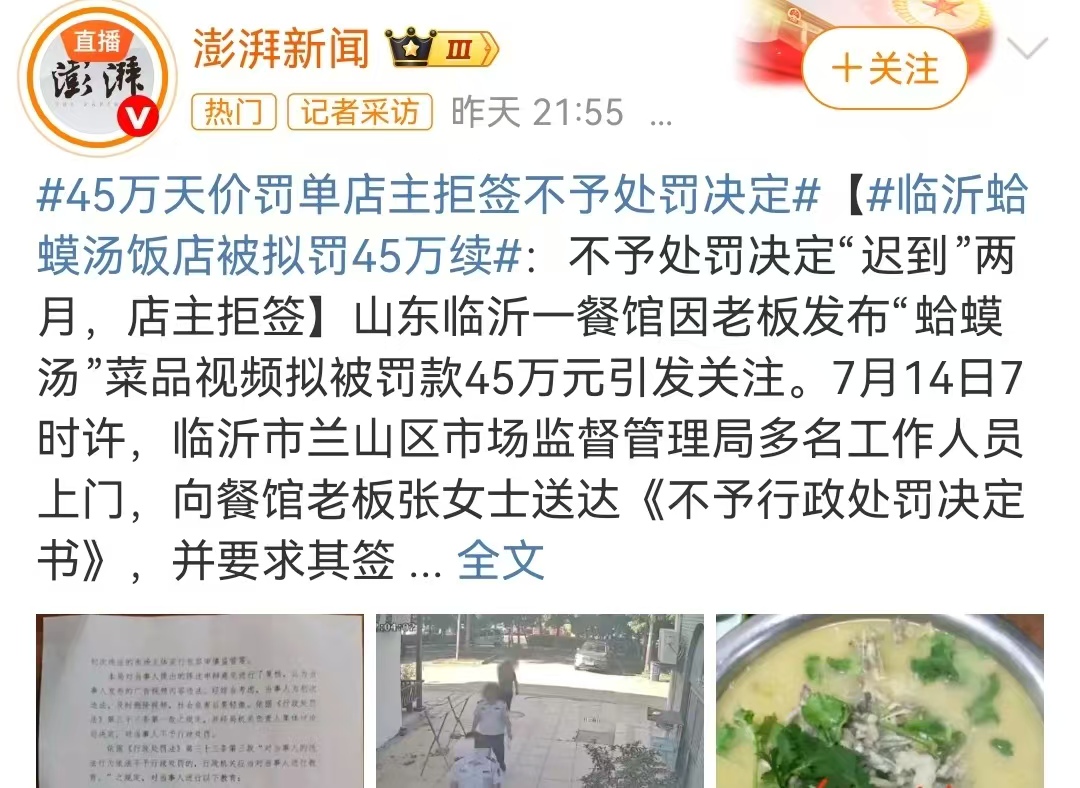 事情得从今年 2 月说起。临沂兰山区有个开餐馆的张女士,在抖音上发了个视频,内容是店里的一道菜,上面写着 “蛤蟆汤”,还有些昆虫食材。本来就是随手发的一段,没成想,3 月下旬,当地市场监管局就找上了门,说她这视频涉嫌违法广告,还打算罚她 45 万。