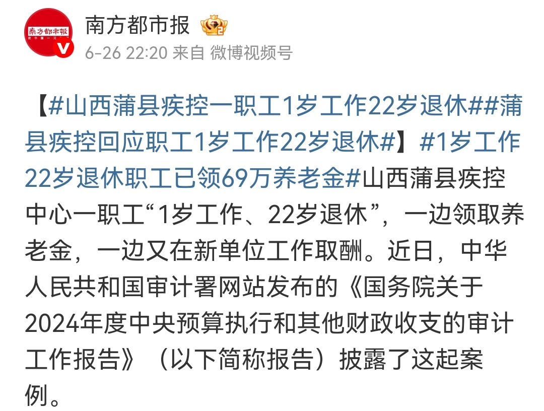 最近有条新闻看得人一头雾水 —— 山西蒲县一位疾控中心职工的档案里,竟藏着 “1 岁上班、22 岁退休” 的怪事。更让人意外的是,这位 “奇人” 不光顺顺当当领了 69 万养老金,还在退休后另找了工作拿双份收入。这事儿是相关部门在查账时发现的,一曝光就成了大伙议论的焦点。