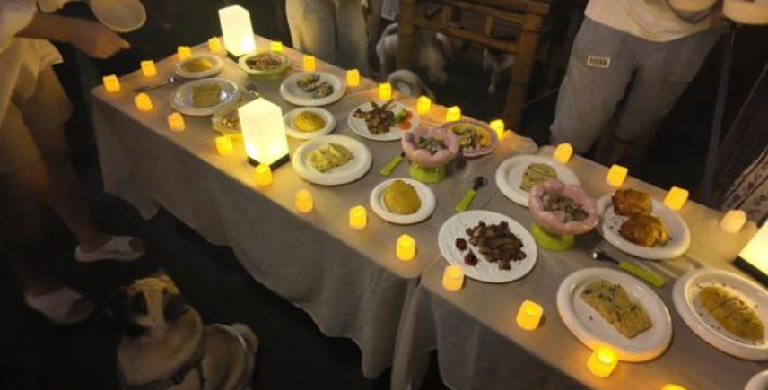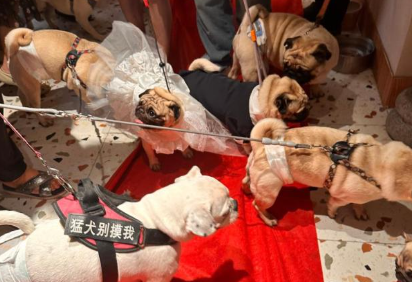 婚礼完全照着人类婚礼的流程来:狗狗们在门口的 KT 板上按爪印签到,“新郎”“新娘” 走红毯,主人作为 “家长” 致辞,还有抛捧花、吃晚宴这些环节,整场下来持续了三个小时。桌上摆满了宠物能吃的餐食,来的人都说,一下子撸到这么多狗狗,太开心了。
