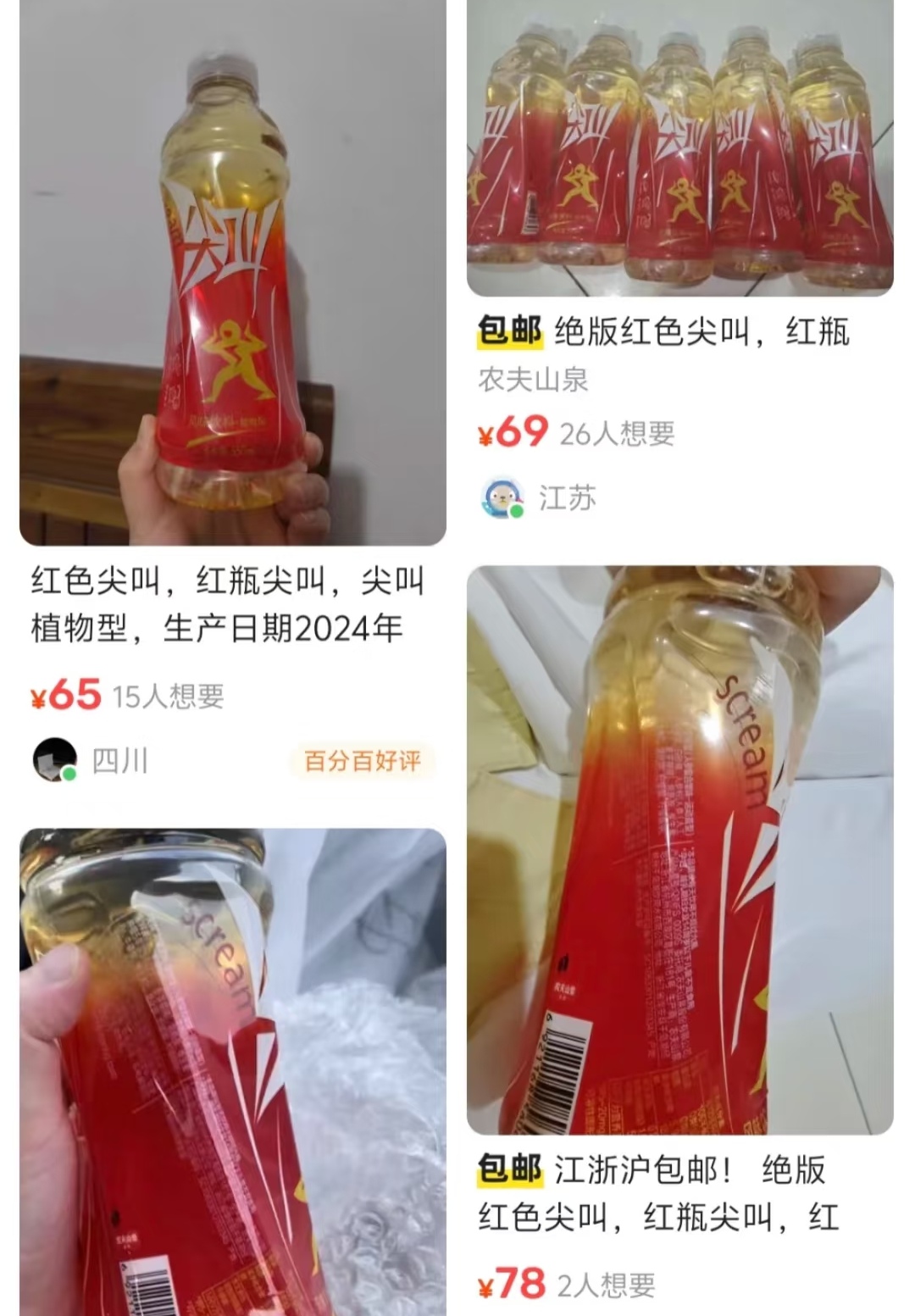 现在打开二手平台,红色尖叫被标上了 “绝版”” 限量 “的标签,一瓶售价从 60 多到 100 多不等,最贵的单瓶卖到 128 元,比原价贵了 20 多倍。更夸张的是,有人把一箱 15 瓶标价 8900 元,还说” 以后肯定更值钱 “。有卖家直言自己囤了货,现在卖 1000 元一箱还包邮,理由是” 这是绝版收藏品 “。