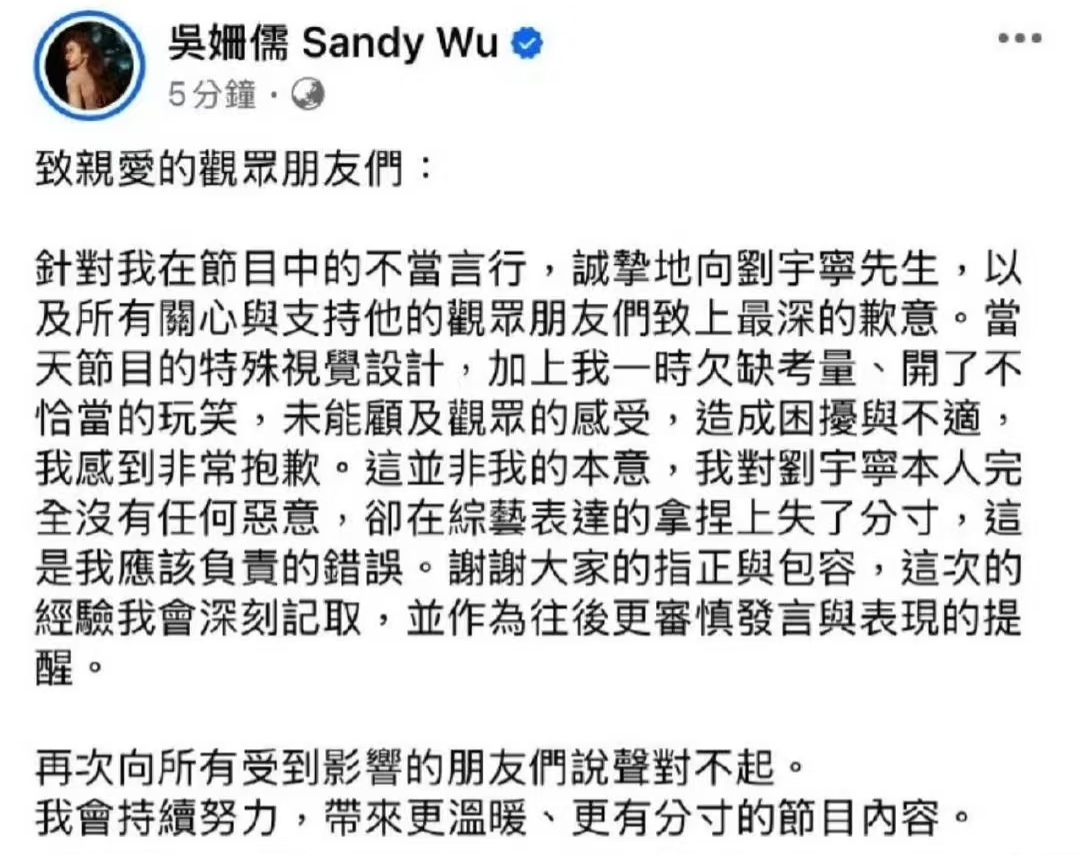 7 月 23 日,吴姗儒通过社交媒体致歉,称对刘宇宁本人毫无恶意,只是一时欠考虑开了不当玩笑,没能顾及观众感受,对此深感愧疚。她强调这并非本意,承诺会深刻吸取教训,未来在言行表现上更加审慎。