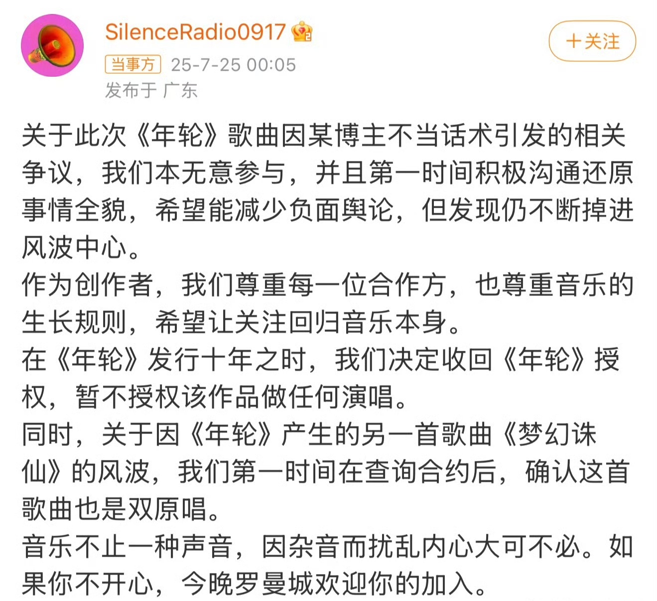 7 月 25 日凌晨,汪苏泷工作室的官方账号发了条重磅消息,说要在《年轮》发行十周年的时候,把这首歌的所有演唱授权都收回来,而且暂时不允许任何人翻唱。这消息一出来,网上立马炸开了锅,好多歌迷和网友都在讨论这事儿,相关话题很快就冲上了热搜第一。