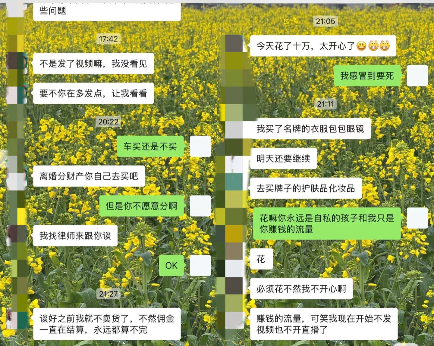 但钱赚多了,两口子的日子却过拧巴了。之前一起开了 4 家公司,今年 5 月王拾富突然退出,大家就猜俩人是不是要散。现在男方直接撕破脸,说小英 “一天花 10 万”,还放话 “离婚没谈拢就不直播带货”,这明摆着是拿全家的饭碗当谈判筹码。