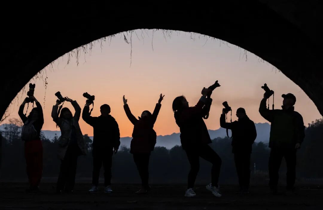 点评:作者逆光拍摄,巧妙利用建筑的弧形结构形成框式构图的效果,同时将合影的摄影人恰当构置其中,人物展现出的生动情态以剪影效果简约呈现,带来精彩的视觉效果。