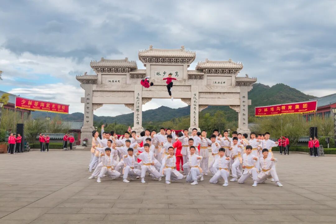 点评:作者居中取景,并将合影人物与牌楼、山景均衡安排,增强画面协调的形式感。合影中人物的状态展现其身份特征,尤其是高高跃起的两个人物,看上去更加吸引人心。