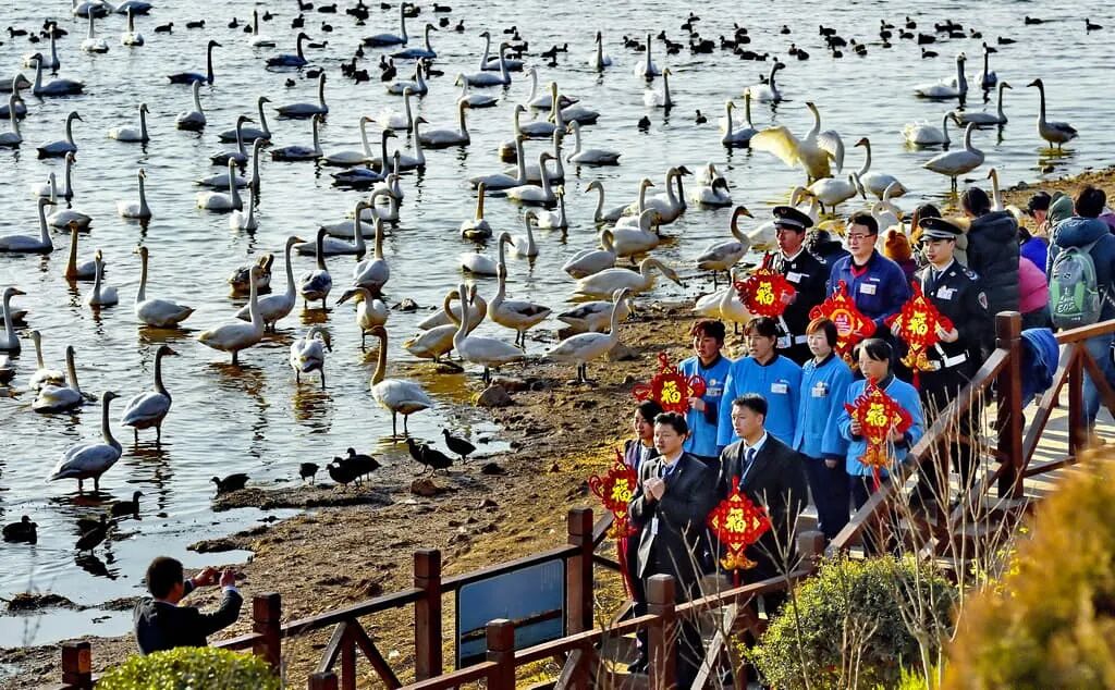 点评:画面取景独特,将合影的人物与背景中聚集的天鹅共置一画,呈点状分布的天鹅以悠闲之姿对合影人物形成衬托,而“福”字等细节的生动刻画,则增加了画面的联想空间。