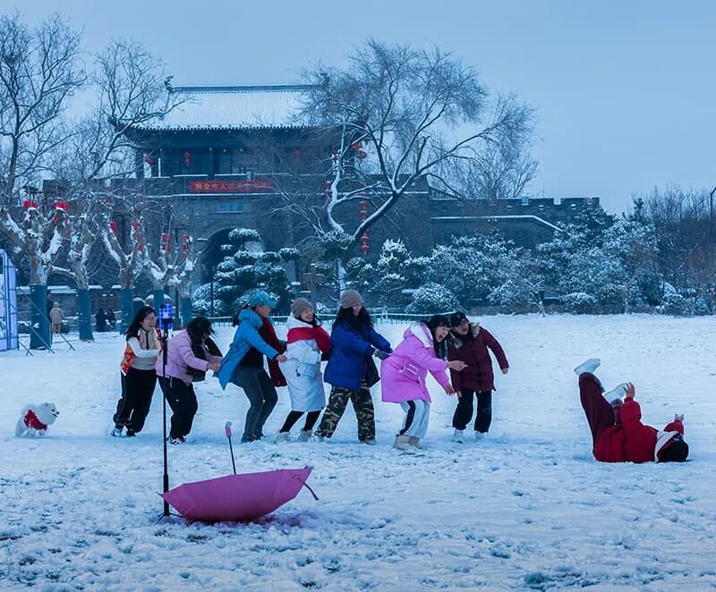 点评:在雪色环境的衬托下,一场老鹰抓小鸡的游戏看上去格外欢乐动人,作者对人物瞬间状态的捕捉,增加了现场的鲜活感和趣味性,将成年人的童心一刻展露无遗。