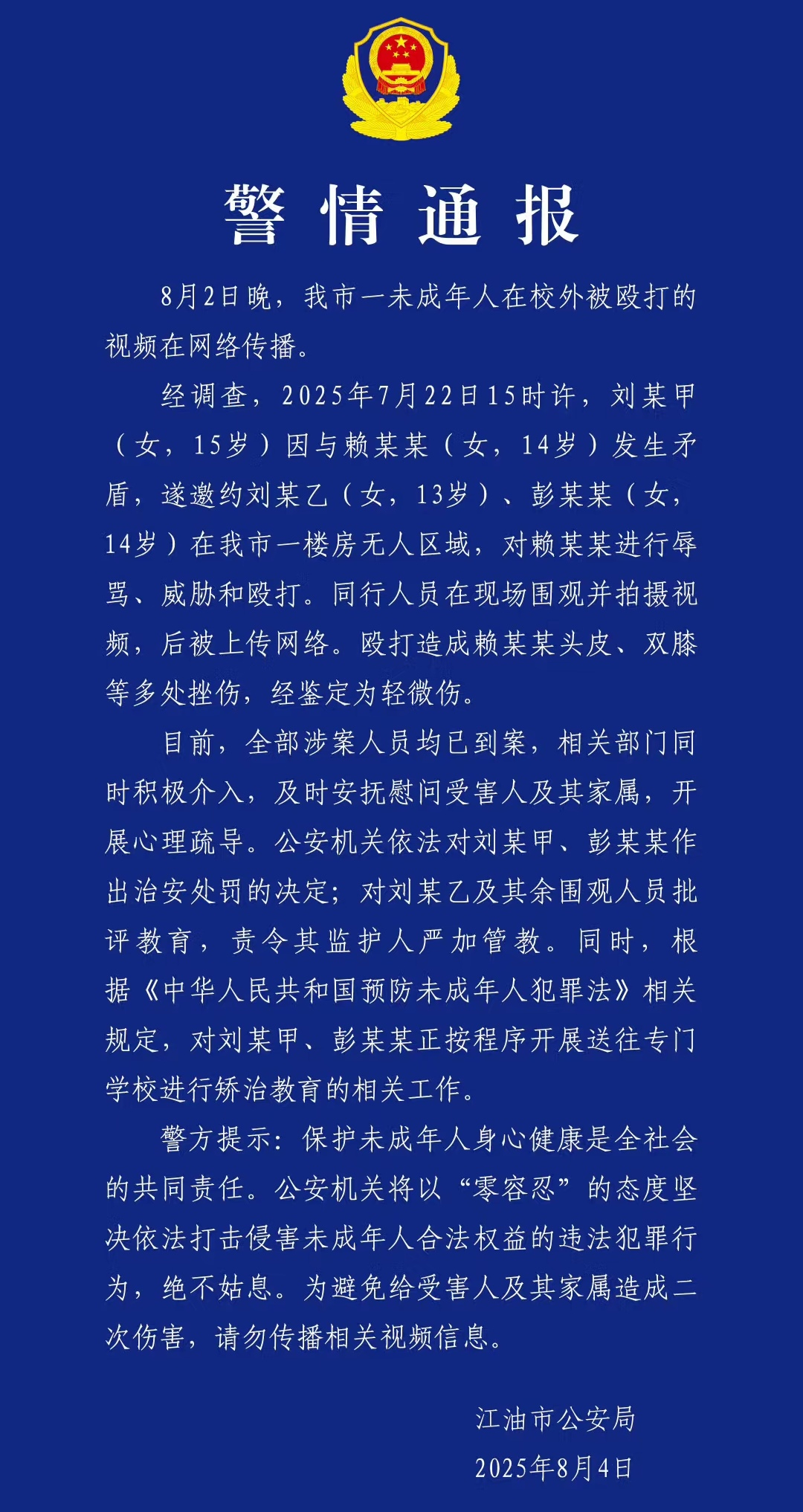 最近网上一段视频看得人直揪心:四川江油有个 14 岁的小姑娘,被好几个同龄人堵在一栋没人的楼里欺负。视频里又是骂又是打的,小姑娘哭得不行,那些打人的孩子还拿着手机拍,好像挺得意似的。这事儿在网上传开后,好多人都气得不行。8 月 4 号,当地警察终于出了处理结果,算是给了大家一个说法。