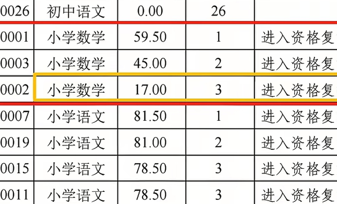 8 月 3 日,云南临沧耿马自治县的特岗教师笔试成绩一公布,就炸了锅 —— 有个报考小学数学老师的考生,只考了 17 分,竟然进了资格复审。当地教育局的工作人员解释说,公告里没设最低分数线,这个岗位刚好就 3 个人有笔试成绩,按高低排下来,自然都能进。末了还补了句:”这考生确实运气好,流程上没毛病。”
