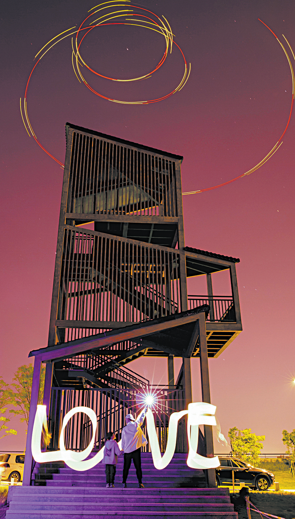 打开无人机的下视照明灯,或在无人机上固定小型的LED灯,这样光线色彩更加丰富多样。将无人机飞至4-5米高度,锁定环绕目标(人、车、帐篷等)。拍摄时我以一座塔台建筑为目标,环绕直径10-15米左右,以每秒0.5米的速度匀速环绕飞行。也可根据需要进行螺旋式上升或螺旋式下降,以获得螺旋光轨。拍摄人物时,人物尽量保持固定姿势,对人物适当补光,以免人物过于模糊。根据拍摄意图,可把无人机绕飞光轨与地面人员光绘相结合,可绘出文字、心形、星星等简单图案。