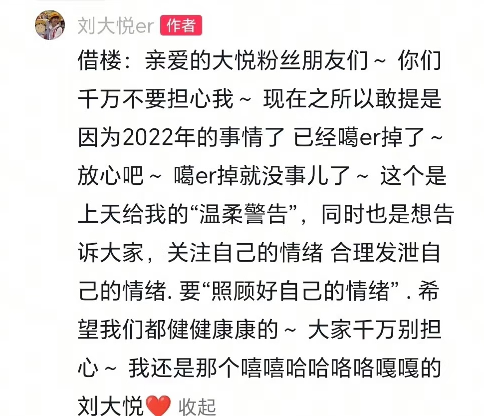 希望刘大悦能早点好起来,继续给我们带来欢笑。也希望咱们每个人都能记住,不开心不是错,别让那些没说出口的委屈、没发泄的情绪,悄悄伤害了自己。该哭就哭,该笑就笑,好好爱自己,比什么都重要。