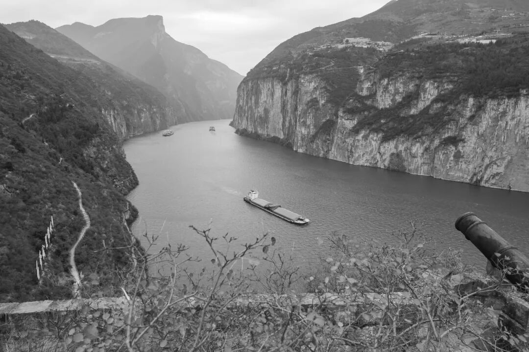 2020年12月16日,重庆奉节夔门,穿梭的货轮和古炮台。《水经注·江水》云:“捍关,廪君浮夷水所置也。昔巴楚数相攻伐,藉险置关以相防捍也”。夔门天下雄,瞿塘峡的西端入口,称为“长江三峡西大门”。
