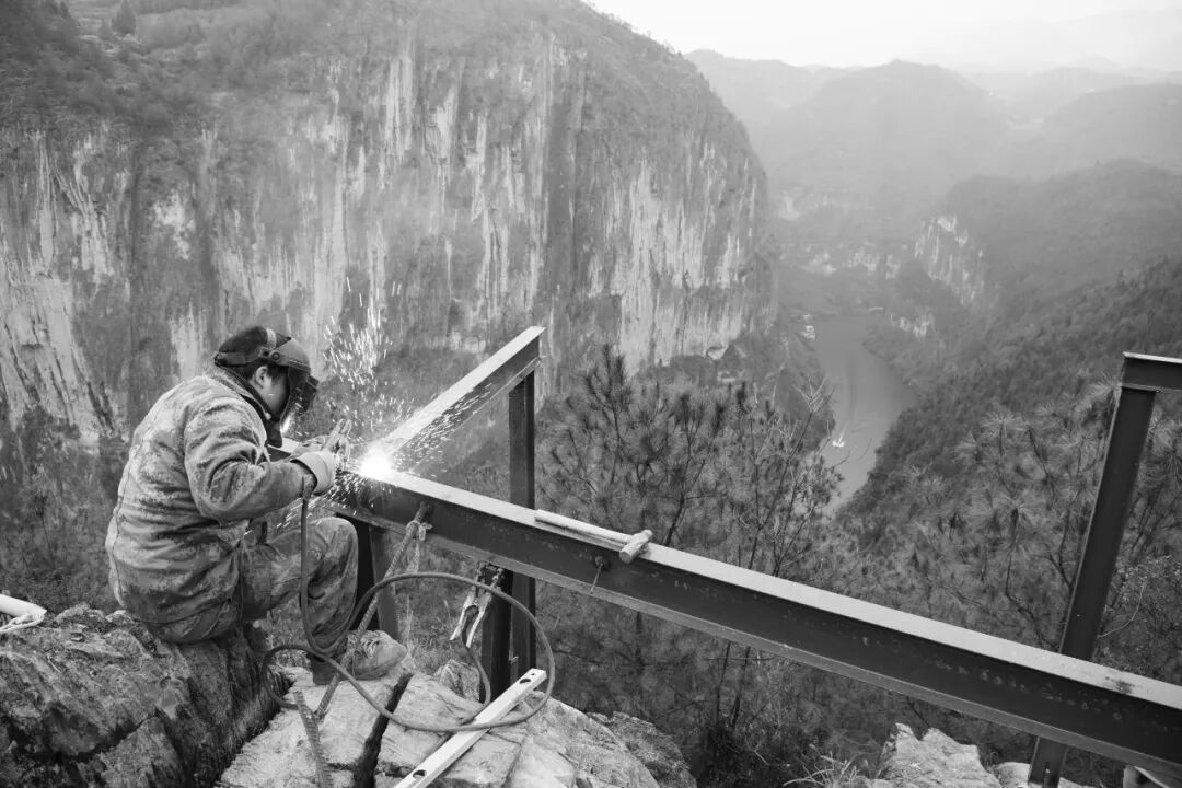 2020年12月15日,重庆巫山原深度贫困村安静村,工人在焊接云顶观景台,乡村振兴之光在小三峡“赤壁摩天”闪耀。《水经注》说:“溪水又南入于大江,江水又东迳巫峡”。大宁河是长江左岸支流,古称盐水、昌江,又名巫溪。