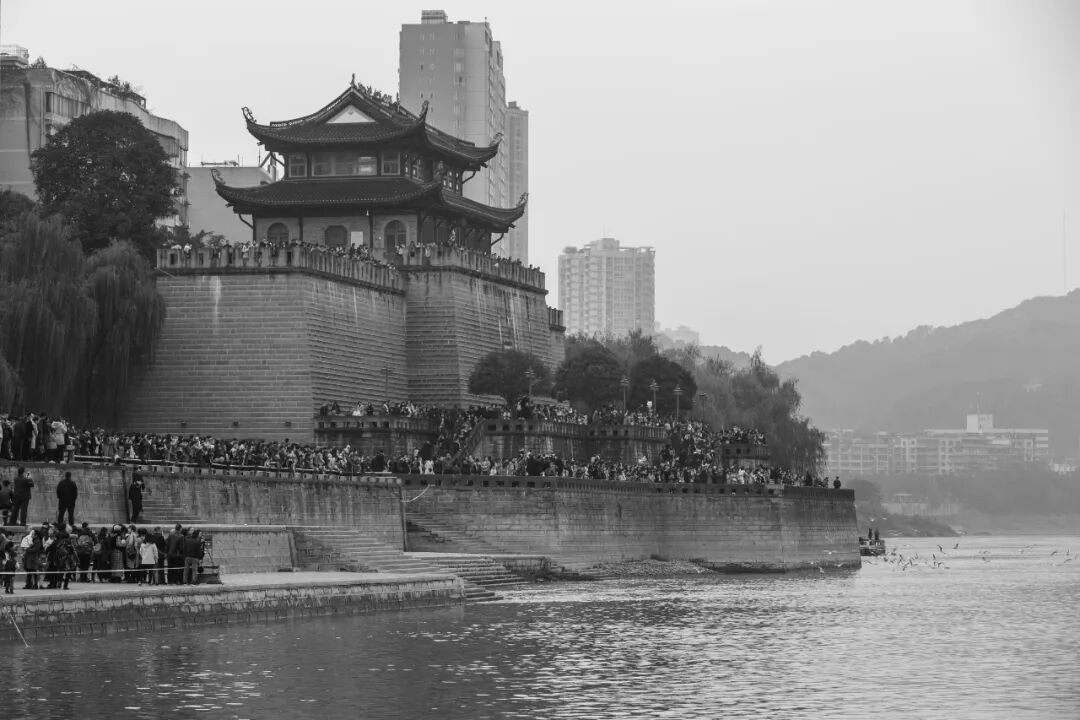 2017年11月25日,四川泸州,飞抵这里歇脚的海鸥和围观的人群。《水经注》有云:“绵水至江阳县方山下入江,谓之绵水口,日中水。”泸州东门城楼是宋代通海门遗存所在,始建于北宋皇祐二年(1050年),2013年重建。