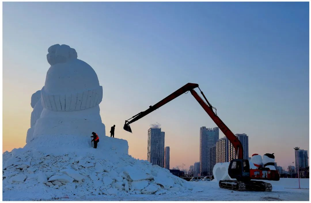点评:雪雕在大小、单双、背侧等对比中极具趣味,挖掘机与正在雕刻的雪雕形成形态、色彩对比,雪雕上的人物相对,正在雕刻的人物服饰色彩鲜明,尤显突出,与机身、另一处雪雕色彩相呼应。远处高楼相映衬,突出了空间感。