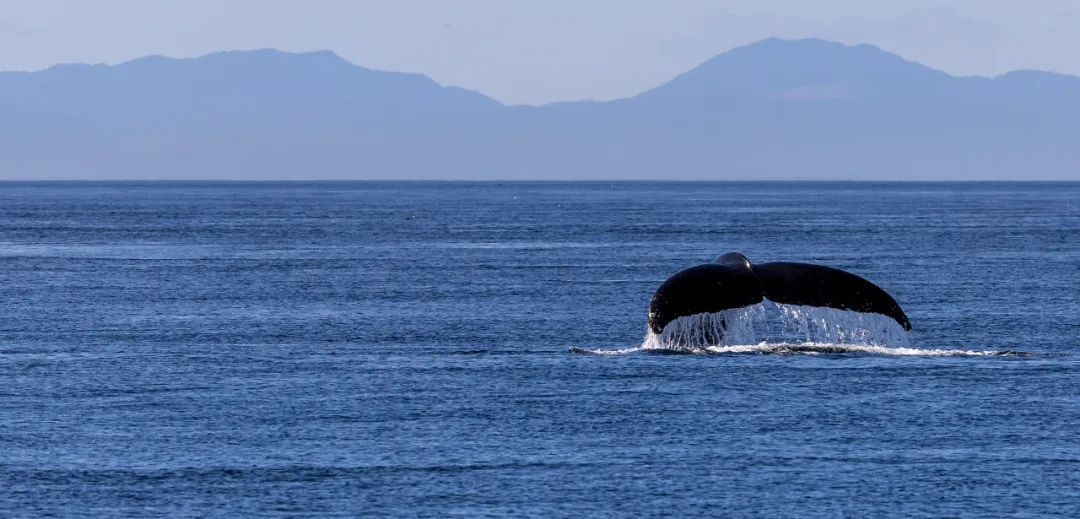 点评:平静的海面舞起的鲸鱼,位于井字形构图黄金分割点处,突出了形态。鲸尾舞动形态与远处山峰形成对比与呼应,构成独特之形。鲸尾落下的阵阵水花,增强了鲸舞的气势与动态。画面在虚实、浓淡之间拉开距离,表现了海的宽阔与画面的简洁。