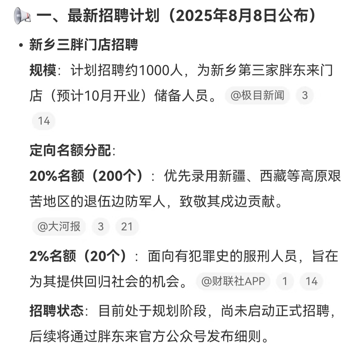 最近,胖东来老板于东来的两条动态引发热议。8 月初,他宣布新乡第三家店将招聘约 1000 人,其中 20% 岗位留给退伍边防军人,2% 岗位面向有犯罪史的服刑人员。没过几天,他又发文劝大家别在评论区问找工作的事,这背后藏着不少值得琢磨的考量。
