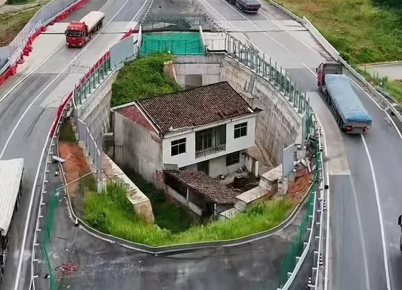 这栋房子的特殊处境源于拆迁分歧。当初修建 G206 绕城公路时,黄先生家房屋在规划范围内,但他对拆迁条件不满,始终未签字,为推进工程只好绕房修路,造就了这一独特景观。