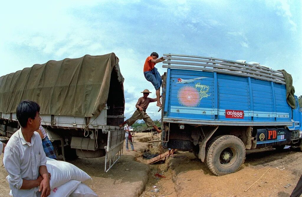 1990年, 瑞丽县姐告的一条小沟曾是中缅两国的分界,脚跨两国货车的缅甸装卸工在劳作,这是瑞丽国境线上早期独特的边境交易方式。刘建明 摄