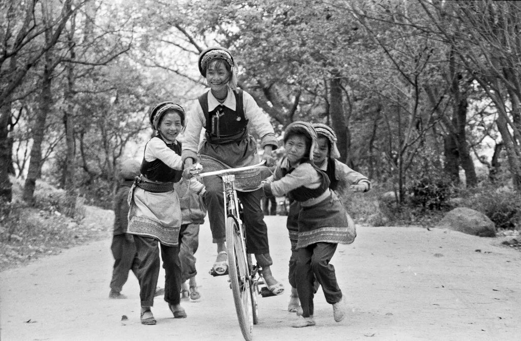1982年,自行车开始成为农村的交通工具,大理喜洲镇的几个白族姑娘在一起学骑自行车。刘建明 摄