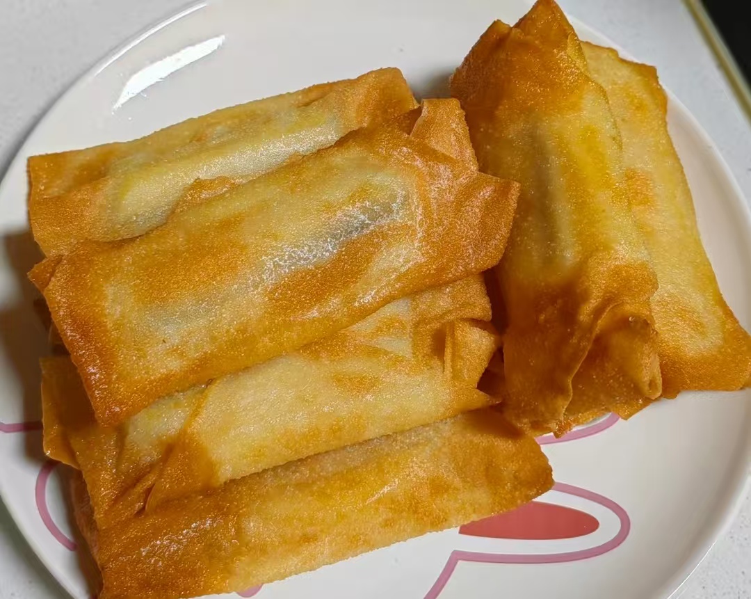 拿一张馄饨皮,中间放水果条,淋一勺酸奶或炼乳,像包春卷那样折起两头再卷紧,最后抹点水粘住。