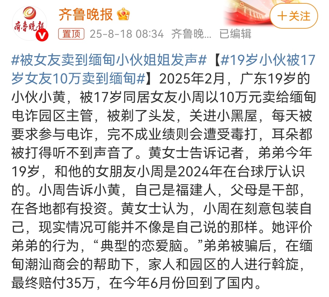 “19 岁小伙被女友以 10 万元卖到缅甸” 的消息引发热议。8 月 19 日,家属披露细节称,为赎回小伙向园区赔付 35 万元。这起事件不仅让家庭蒙受重创,更警示大众警惕跨境犯罪陷阱。