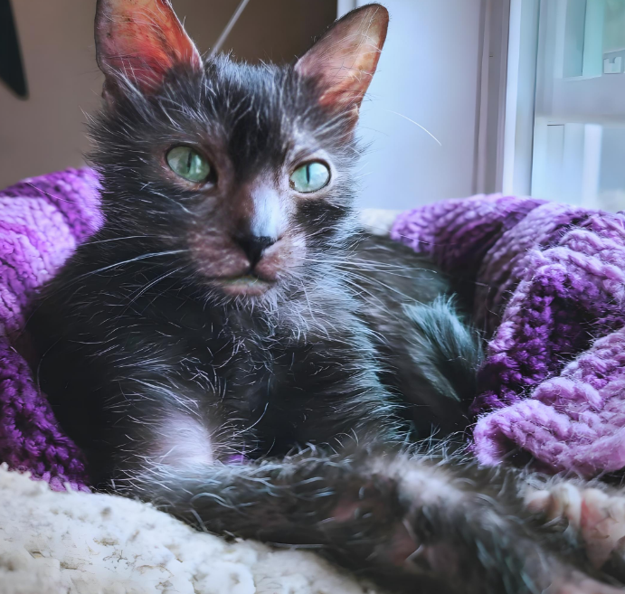 和那种几乎没毛的斯芬克斯猫一样,狼猫得吃好粮,偶尔还得洗澡,不然皮肤容易出油。大多时候它们掉毛比别的猫少,但得知道:狼猫会换毛,有时候可能掉得快秃了,养它们的人管这叫 “变狼时刻”,还挺有意思的。