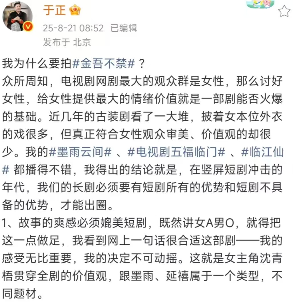 总之,于正把话放这儿了,《金吾不禁》到底能不能爆,现在谁也说不准。咱们就等着开播,看看它是不是真有那么神吧!