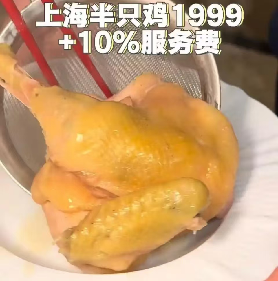 近日,一则 “上海餐厅半只鸡卖 1999 元” 的视频引发热议。视频中,博主询问菜品价格,店员称该半只鸡售价 1999 元,用的是养满一年的广东清远鸡,还加了金钩翅(鱼翅),这一价格让网友纷纷质疑。