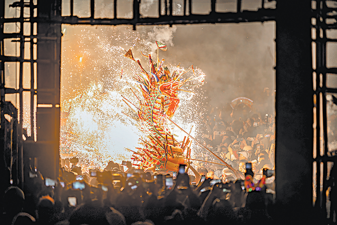 点评:利用建筑结构作框式构图处理,形成画中有画的效果,不仅增加了形式美感,也在空间的递进中营造出明与暗、虚与实的对比和过渡节奏,作为主体的火龙则以生动的情态和明亮的色彩吸引人心。
