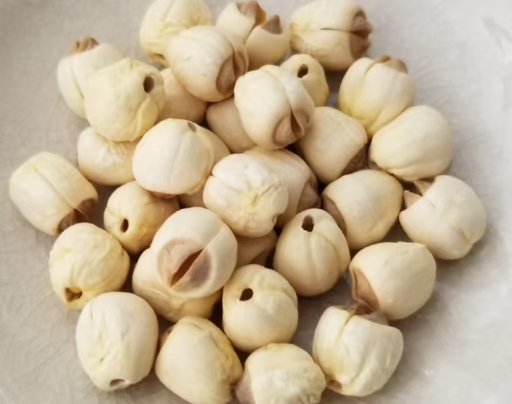 - 新鲜莲子:先把莲蓬掰开,取出带壳莲子。烧一小碗开水,把莲子放进去烫 10 秒,捞出来过凉水,种皮一撕就掉!然后用牙签从莲子一头扎进去,把中间的莲芯顶出来(莲芯苦,一定要去掉)。