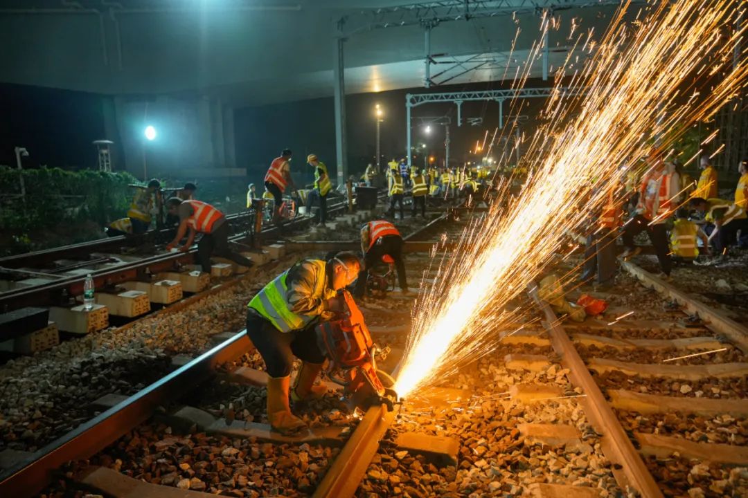 2024年11月12日,在位于海口市粤海大道1号的海口站,300多名工人对站改插铺5# 、9# 道岔(连接平行进路)进行线路切割、道轨拨移、插铺道岔、线路连通、回砟捣固等施工。据了解,该工程是海南自贸港建设海南铁路封关运作项目的海口南港“二线口岸”(普铁旅客)查验设施建设项目中的一项内容。
