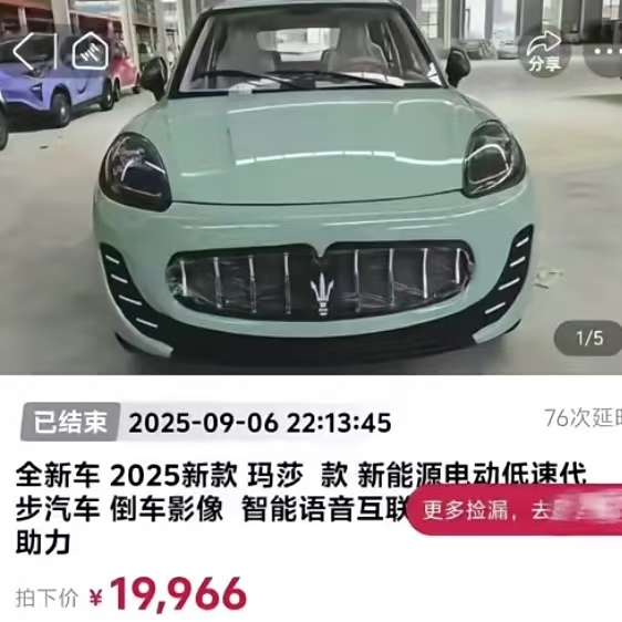 广东的冯先生深夜刷手机时,被 “166 元起拍玛莎拉蒂” 的信息吸引。他正想换辆自动挡车,见页面上三叉戟标十分眼熟,当即交了 3500 元保证金出价。次日醒来却傻了眼:自己以 19966 元拍中,加上佣金共 21563 元,可这辆 “玛莎拉蒂新能源车”,实际是贴了高仿标的老头乐。