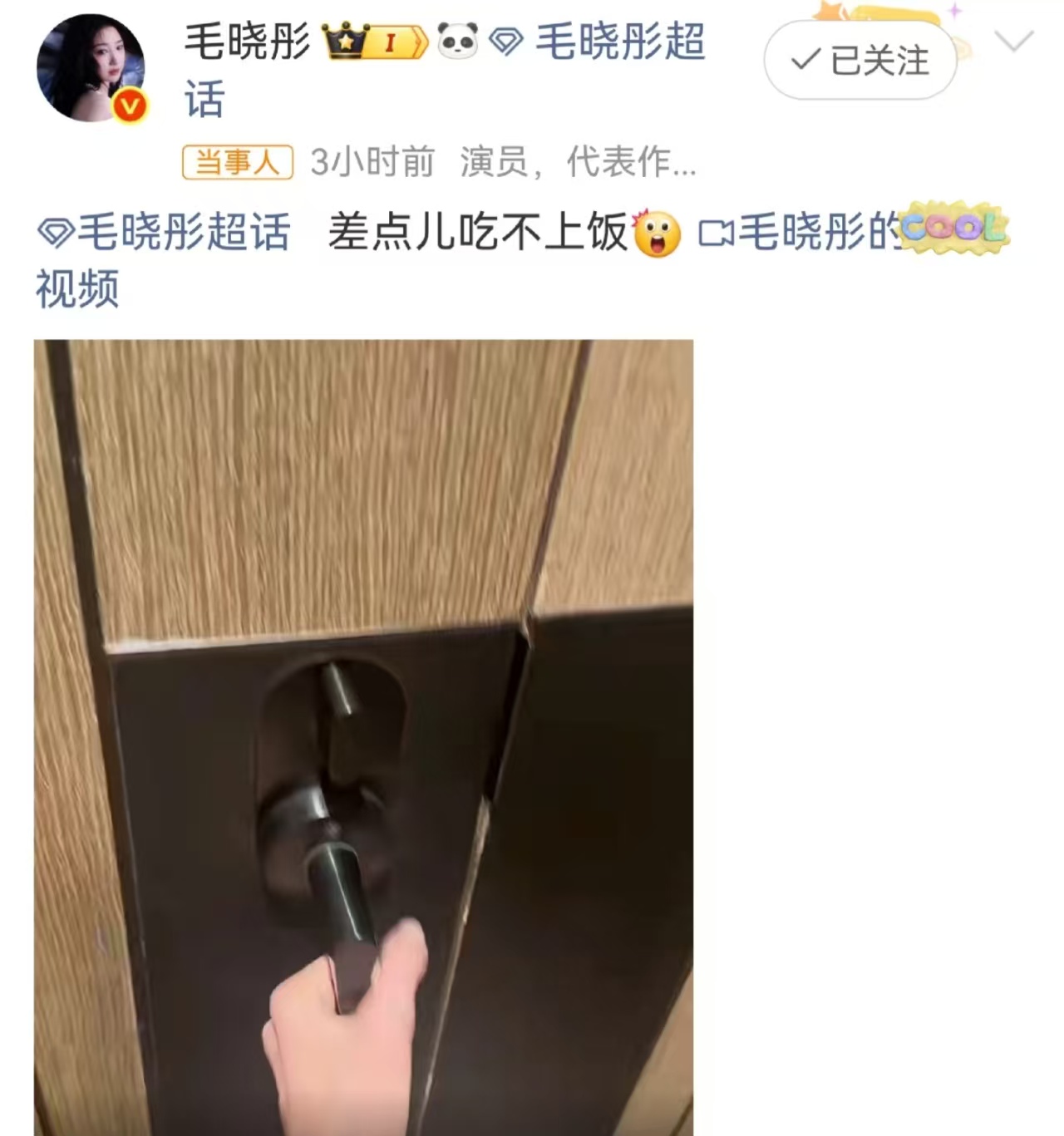 据了解,事件发生在红毯环节结束后,毛晓彤卸下精致妆容与华服,正准备稍作休整赴晚餐之约时,发现房门突然无法打开。起初她还尝试冷静检查门锁、变换开合方式,但折腾数分钟后,纹丝不动的房门让原本淡定的她渐渐开始着急。随着时间一分一秒流逝,担心错过餐会的毛晓彤终于按捺不住,对着门外清亮喊出:”你好,有人吗?我出不去了!” 那带着几分焦急又不失可爱的语气,恰好被路过的工作人员听到。