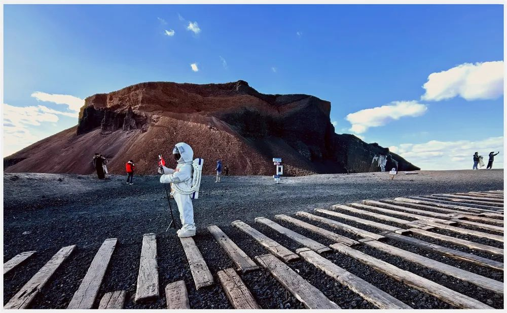 2024年10月22日,内蒙古乌兰哈达火山群,游客身穿宇航服在景区打卡。