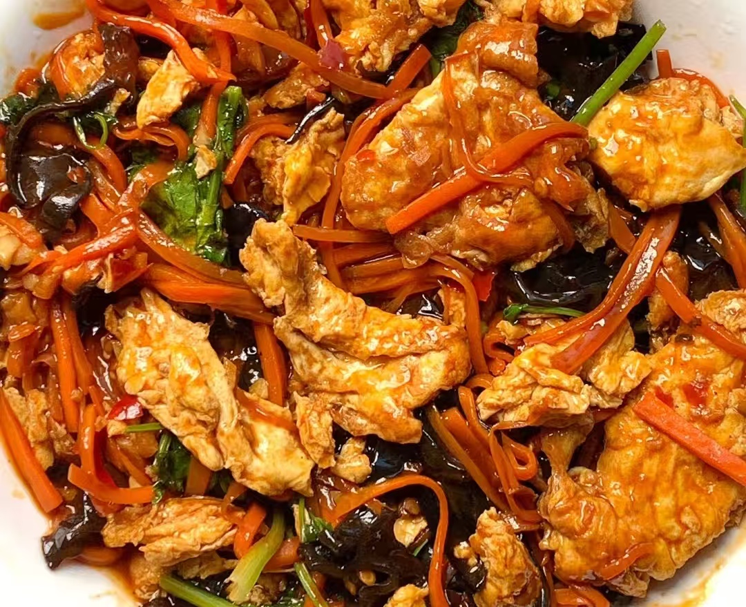 最后炒香调味出锅:锅里留少许底油,开小火把葱姜蒜炒出香味,转中火先放胡萝卜丁炒 1 分钟,再加入木耳丁和青椒丁炒 30 秒,撒少许盐;然后把炒好的鸡蛋块倒进去,轻轻翻炒均匀,淋上提前调好的调味汁,开大火炒 10-15 秒,直到汤汁变浓稠,最后撒点葱花就能出锅了。