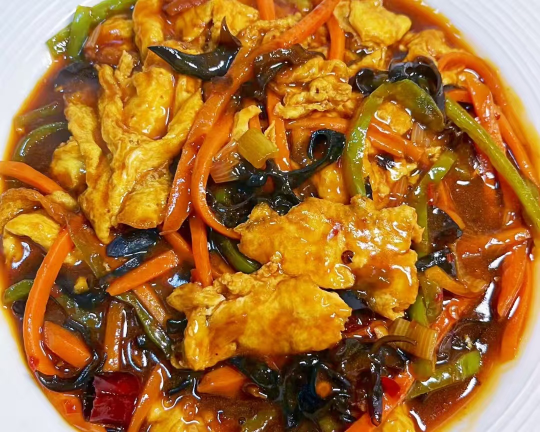鱼香鸡蛋酸甜咸鲜,配米饭超下饭,15 分钟就能做好,新手也能轻松成功。2 人份的话,要准备这些材料:主料是 3-4 个鸡蛋,再备一小段胡萝卜、1 个青椒,还有提前泡发好的 5-6 朵干木耳;调料得准备切好的葱姜蒜,另外提前调一碗调味汁,放 2 勺生抽、3 勺香醋、2 勺白糖、1 勺淀粉、3 勺清水,再加少许盐搅匀,食用油适量就行。