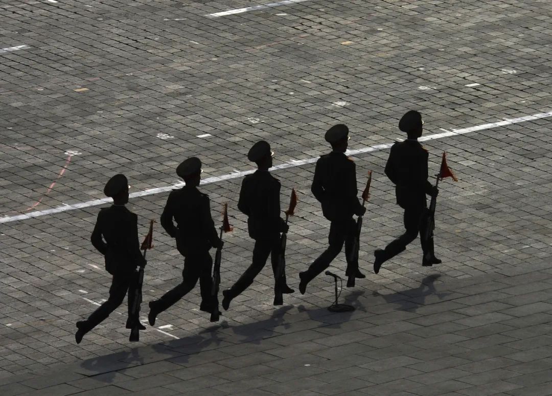 2010年10月10日,朝鲜在平壤金日成广场举行盛大阅兵式,庆祝朝鲜劳动党建党65周年。图为阅兵式上的标兵入位。