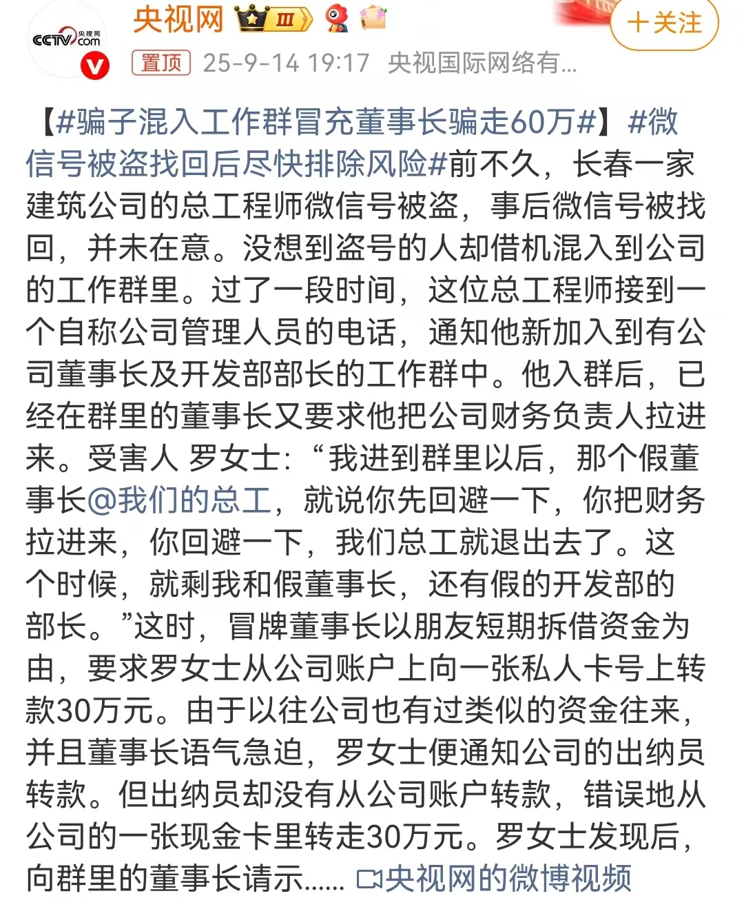 过了一阵,总工接到个自称 “公司管理人员” 的电话,让他进一个新工作群,说群里已有董事长和开发部部长。总工没多想就进群了,刚进来,群里的 “董事长” 就让他把财务罗女士拉进来,接着又让总工 “先回避”。等总工退群,群里就剩罗女士、“董事长” 和 “开发部部长” 三人。
