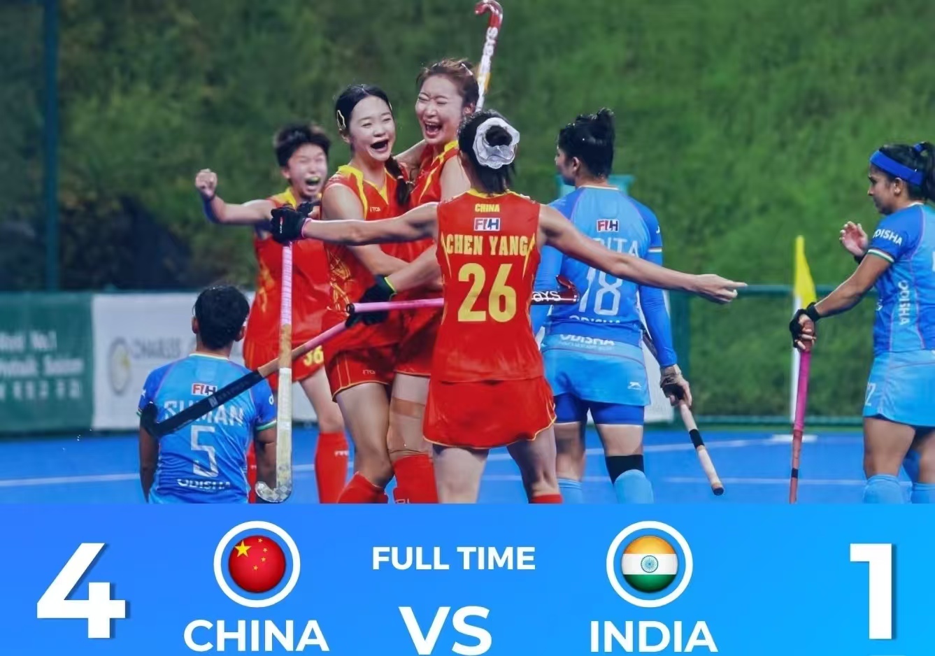 比赛开局并不顺利,仅 59 秒印度队就借短角球破门,中国队首节虽获短角球却未能得分,1-0 的比分让气氛凝重。但姑娘们迅速调整,第二节欧紫霞在弧顶一脚劲射扳平比分;第三节李红抓住反击机会推射反超;第四节邹妹容门前垫射、钟嘉琪右路反手射门,连入两球锁定胜局。