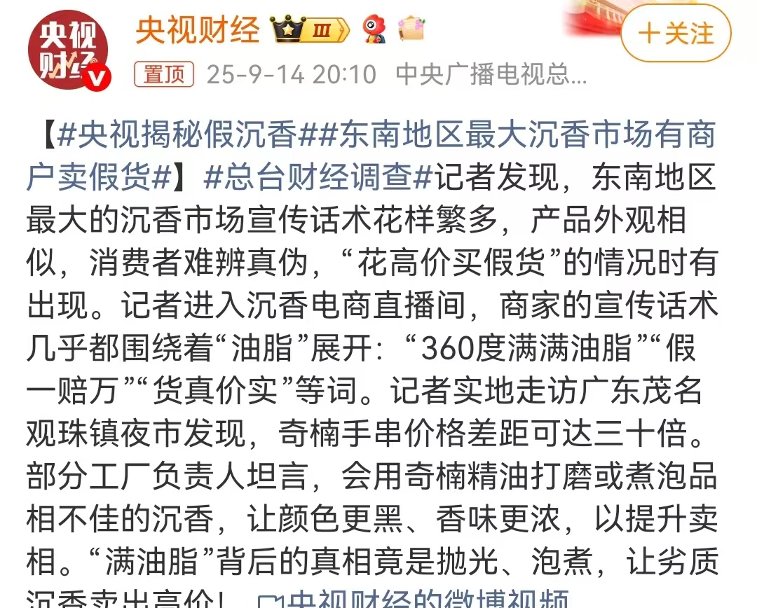 最近央视曝光了 “中国沉香之乡” 广东电白观珠镇的造假乱象 —— 不少商家 “前店后厂”,后院作坊拿普通白木泡油做假沉香。曝光后,32 家作坊被封,查出 1.8 吨造假原料,涉案值达 4200 万,让 “一寸沉香一寸金” 成了笑话。