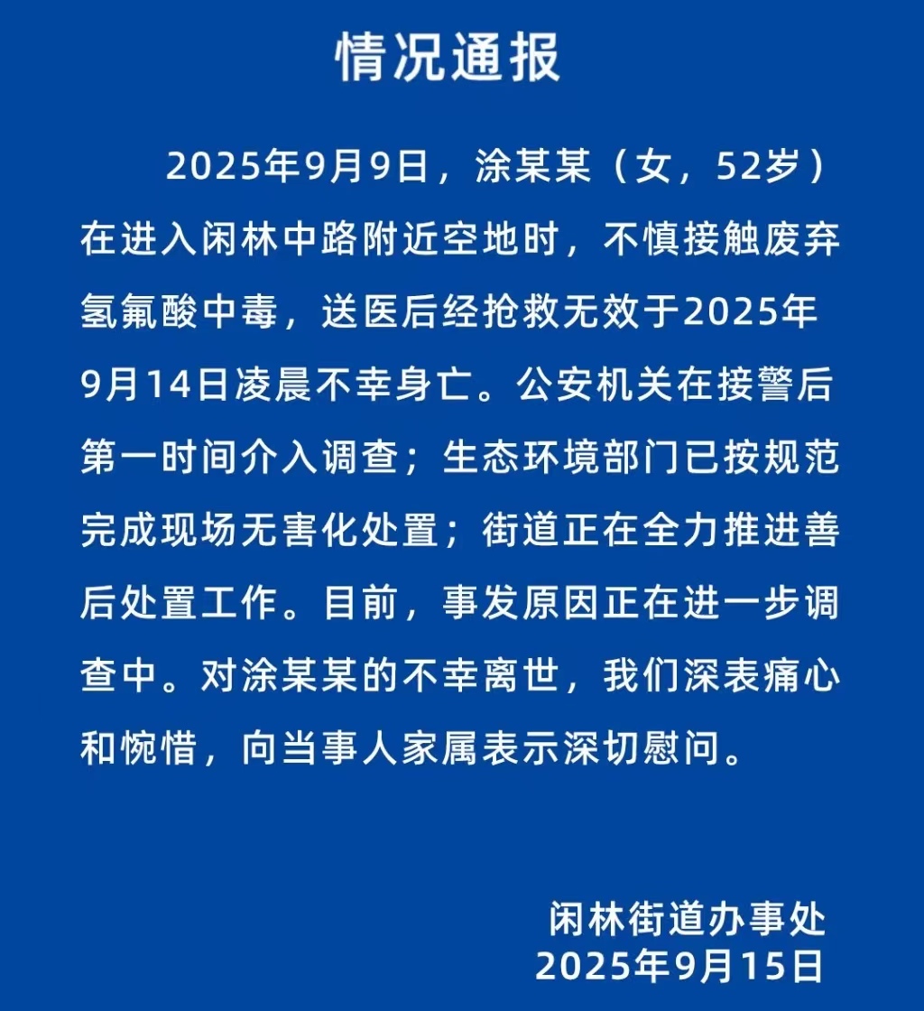52 岁的涂阿姨怎么也想不到,傍晚出门散个步,竟再也没能回家。那天她像往常一样,去闲林中路附近的空地溜达,脚下的地面看着平平无奇,却藏着一滩没人管的氢氟酸 —— 这东西腐蚀性极强,沾到皮肤就会造成严重伤害。就因为不小心踩了上去,涂阿姨的皮肤和脚很快被烧得厉害,送进医院后情况越来越糟,后来还出现了心脏衰竭、没法呼吸的危急情况,尽管医生拼尽全力抢救了 5 天,还是没能留住她,9 月 14 号凌晨,她还是走了。