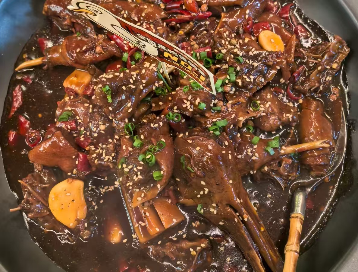 2、热锅冷油放冰糖,小火炒至浅琥珀色,加姜蒜、洋葱炒香,放豆瓣酱和甜面酱炒 1 分钟出红油;下鸭肉中火炒至微黄裹酱,加生抽、老抽、香料包,倒热水没过鸭肉 2cm,大火沸后转小火焖 30 分钟。