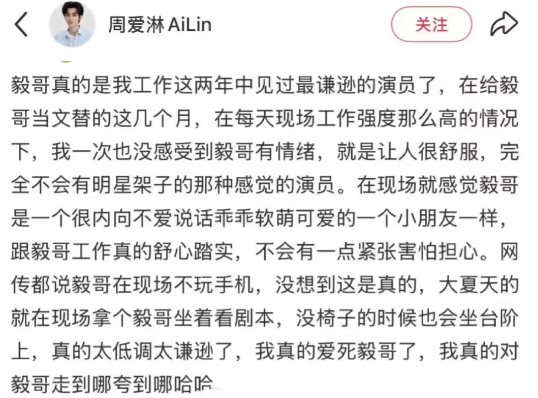 最近,《赴山海》文替演员周爱淋的一篇长文引发热议,让大家看到了镜头背后成毅的真实工作状态。