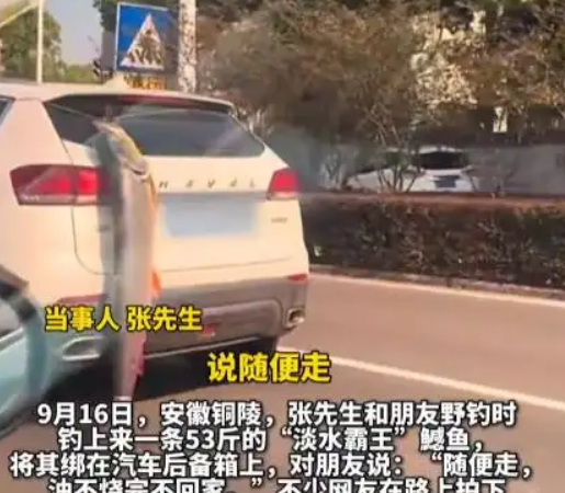 结果他开车上路时,后备箱上那条晃来晃去的大鱼,一下就成了街上的 “焦点”,路过的人都忍不住多看几眼。还有网友把这场景拍下来发上网,大家看了都乐了,调侃说:”明明家离得不远,估计在路上开了好几个小时吧,肯定是被围观耽误了!”