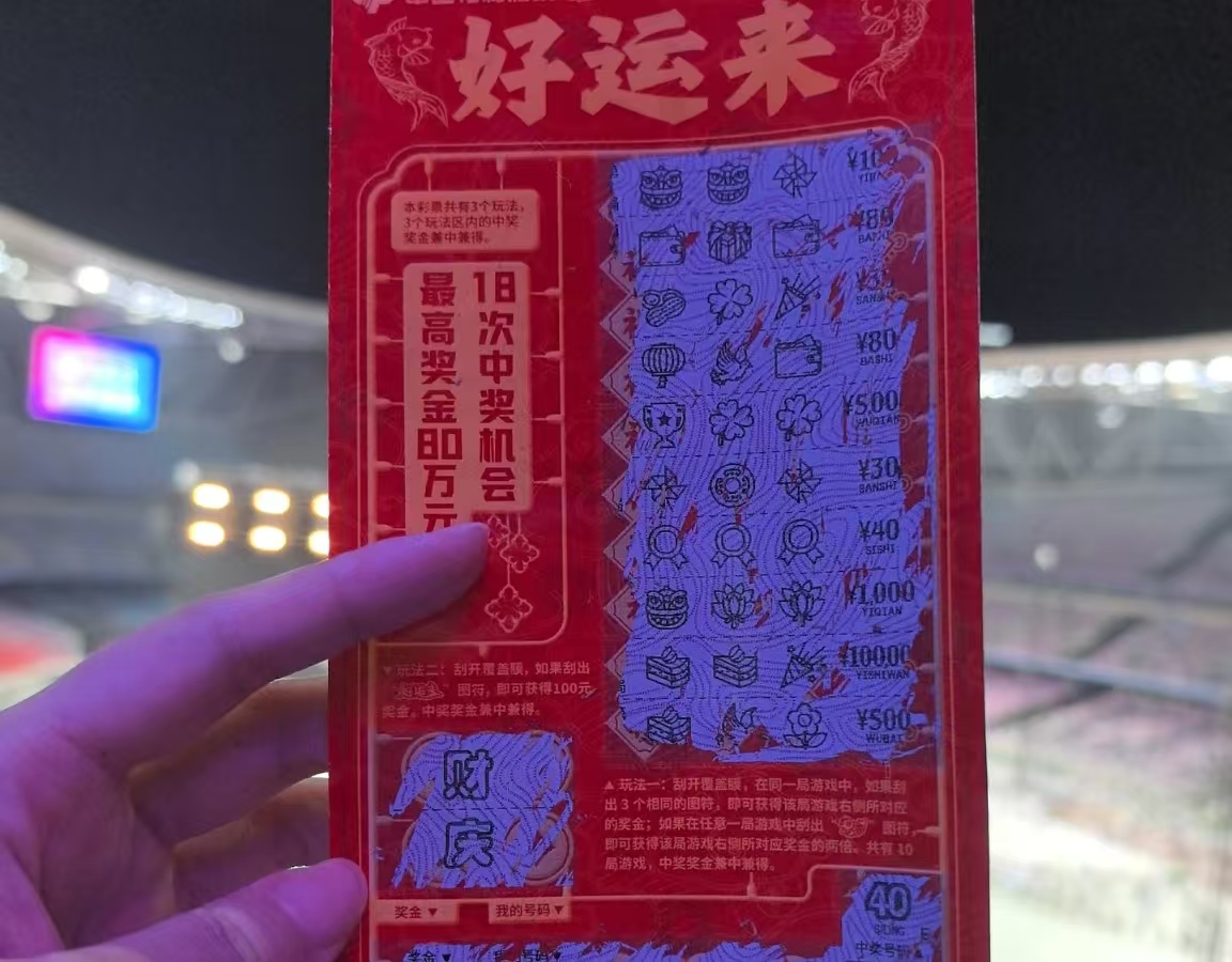 当晚周深唱起《好运来》时,五万观众几乎同时掏出刮刮乐,“沙沙” 的刮奖声混着歌声,比过年还热闹。有人顾不上整理领带,使劲抠彩票涂层;看台上一有尖叫,周围人就立马伸脖子看 “是不是中了”。
