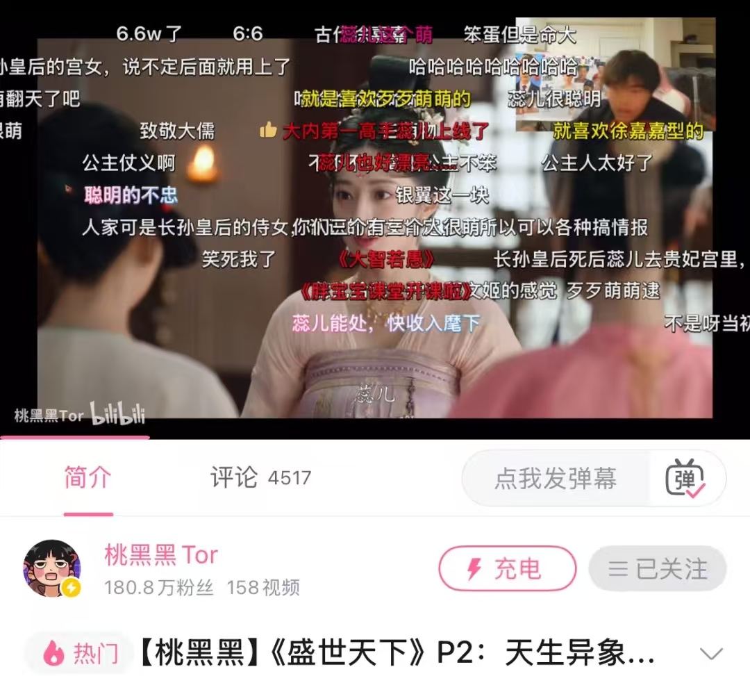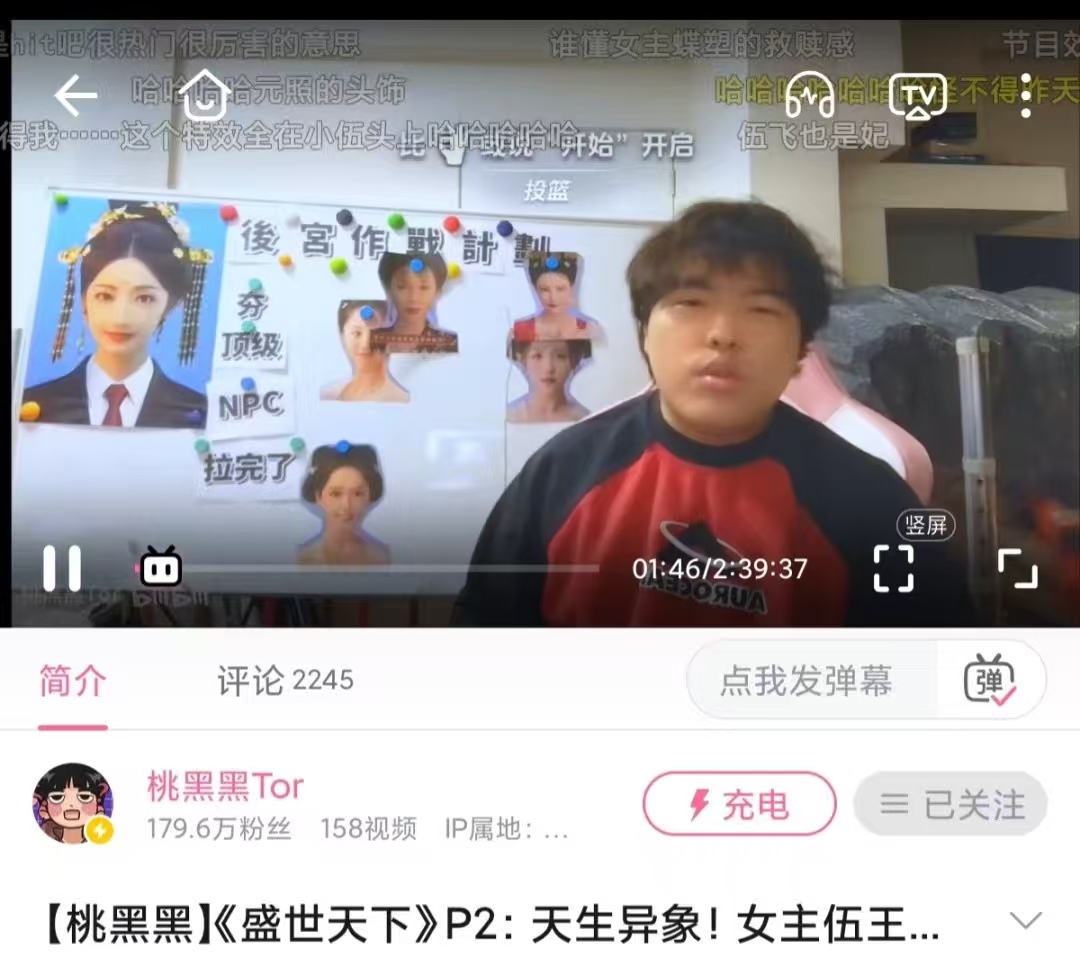 这背后是互动影游的新阶段:对比 2019 年《隐形守护者》,《盛世天下》靠主播合作探索 “游戏 + 直播” 模式,头部主播商单撑起 2500 万录屏播放量。桃黑黑从游戏展示者变为文化解构者,借吐槽反思等级制度、呼应性别平等,且其团队与游戏制作组均重质量,他还与游戏作者分商单收益,强化生态健康。