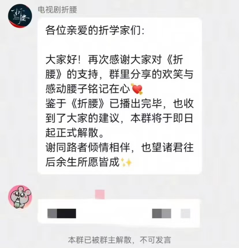 不过也有不同声音:有人说剧播完解散粉丝群很正常,《赘婿》《与凤行》都这么做过,是项目收尾。但《折腰》正处热度峰值,还叠着导演 “偏心” 的旧矛盾、主演的新负面,“一刀切” 解散就显得格外扎眼。