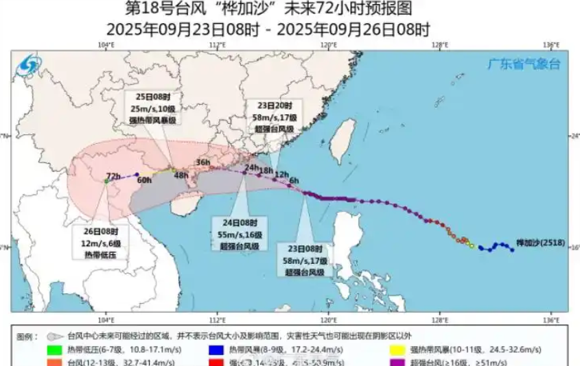 根据气象部门的预测,今年第 18 号台风 “桦加沙” 从 9 月 23 号开始,就会对广东造成严重影响,到时候会有狂风,还有暴雨甚至特大暴雨,防范起来可得加把劲。大家都知道之前的 “天鸽” 和 “山竹” 台风吧?这次 “桦加沙” 的强度跟 “天鸽” 差不多,影响范围又像 “山竹” 那么广,预计 9 月 24 号会在广东中西部沿海登陆。到时候,广东几乎全境都会刮 8 级大风,风力达到 12 级的范围,半径能有 80 到 120 公里,所以大家一定要提前做好应对大灾害的准备。